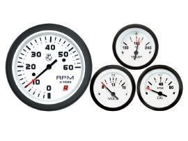 Anti-fog lens. White face and black bezel; black graduations. Set includes 0-6000RPM tachometer, oil pressure gauge, battery meter and water temperature gauge.All illuminated. Mounting hardware also included.