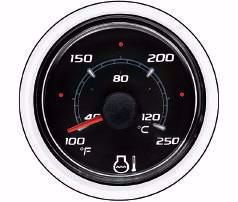 Dual scale (English and Metric) coolant temperature gauge, black face, glass lens.