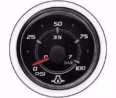 Dual scale (English and Metric) 0-100 psi oil pressure gauge, black face, glasslens. Fits a standard 2-1/8" (52mm) diameter hole.Application of this gauge will depend on the individual engine model and itsavailable sensors.