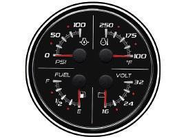 4 in 1 gauge, no logo, black face, glass lens. Oil pressure (0-100 psi), oiltemperature, voltage (24V), and fuel level functions. Fits 110 mm diameter hole.