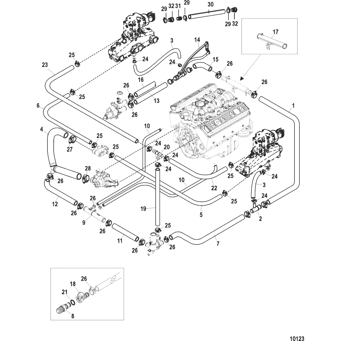 | 10 | 8M0062590 | --HOSE, Cylinder Block Drain to Distribution Fitting | 8623175 | SS |
