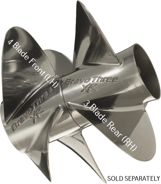 Designed for 250-520 HP gas and diesel sport cruisers and performance Bravo 3 applications. A large diameter 4 blade forward (front) propeller followed by a smaller diameter 3 blade aft (rear) propeller feature built-in cup for incredible handling and improved fuel economy at cruise. Intended for the Bravo Three XR drive but can be used with the Bravo 3 and Bravo 3 X drives.