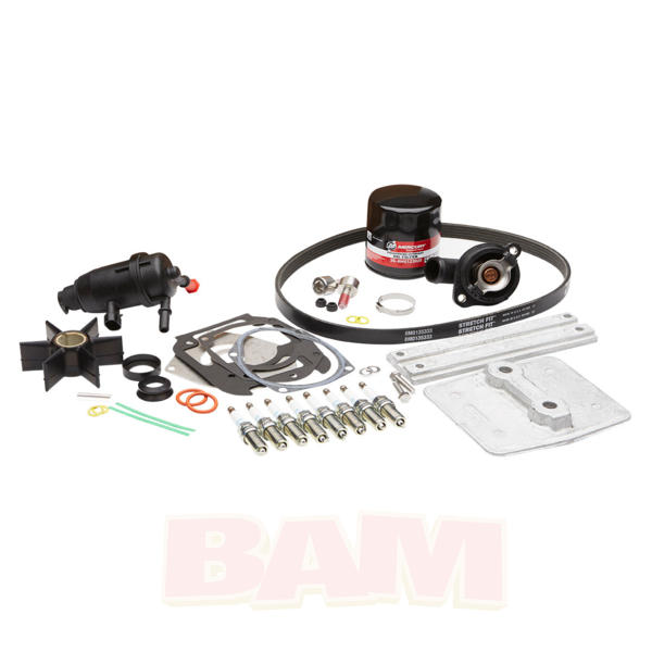 Oil filter, fuel filter, 2-oil drain seals, spark plugs, thermostat, alternator belt, waterpump repair kit and anodes.