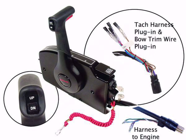 This control features a handle mounted power trim switch, 20 ft. (6.1 m) harness, built-in warning horn and includes power trim leads for front mount switch.